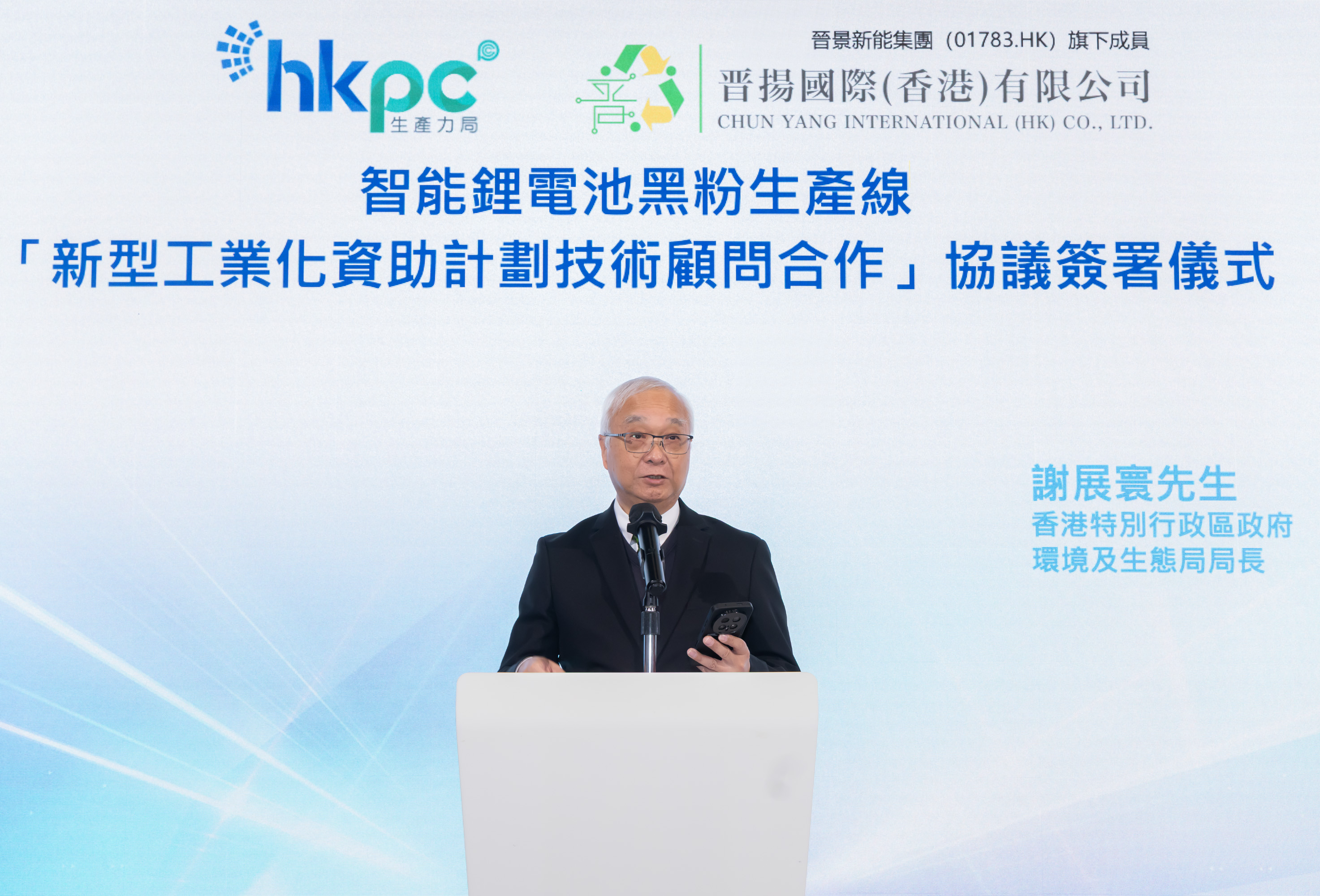 本次活動榮幸邀請到環境及生態局局長謝展寰先生擔任主禮嘉賓並發表致辭。他指出,國家「十五五」規劃建議提出堅持高品質發展,以新發展理念引領發展,因地制宜發展新質生產力,加快經濟社會發展全面綠色轉型,建設美麗中國。他進一步表示,晋揚國際位於環保園的「香港首間動力電池處理設施」,不僅是解決本地電動車退役電池處置問題,更可以將電池轉化成再生黑粉供應內地及周邊地區,體現香港企業作為“超級聯繫人”推動國家綠色產業鏈發展的角色。此次晋揚國際與生產力局透過「新型工業化資助計劃」展開合作,將強化本地電池回收的技術和能力,正是企業積極配合國家和本地發展需要,抓緊發展綠色產業的機遇,堅持高品質發展,以新理念引領發展新質生產力的一個示範。他最後祝願合作項目順利推展,為本地增強綠色發展動能作出更大貢獻。