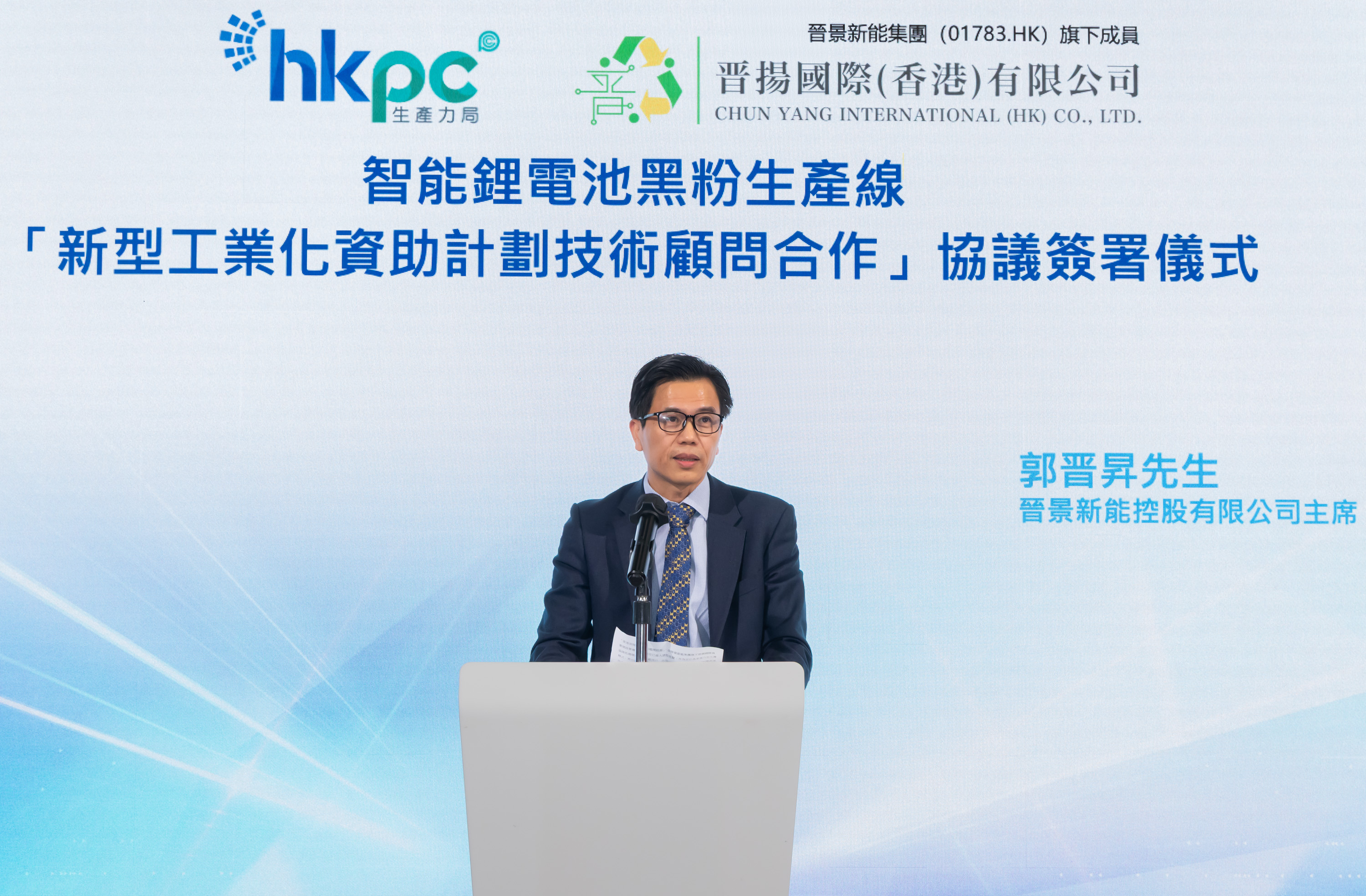 晉景新能集團主席郭晋昇先生表示,「科技革命與產業變革正在加速進行。擁抱新型工業化,是香港企業向前發展的必然選擇, 本次簽約儀式,既體現了企業與專業機構在綠色科技領域協同創新的合作模式,亦展現出香港在新型工業化道路上踏實前行的決心。立足於政府搭建的堅實平台,依託於合作夥伴的專業力量,我們有信心、也有決心,將這座設施,打造成為彰顯香港新型工業化發展成果、引領綠色科技發展的典範工程。」