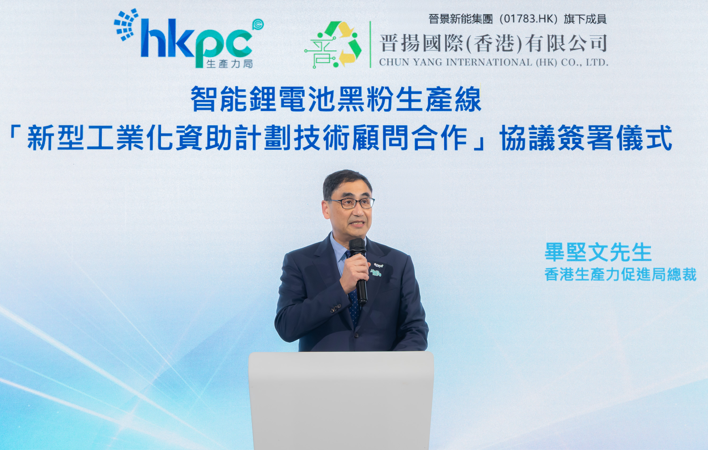 香港生產力促進局總裁畢堅文先生表示:「近年,新能源汽車在香港的市場佔有率越來越高,香港未來將面臨大量的動力電池回收再利用的問題。我們將協助晋揚國際設立鋰電池黑粉智能生產線,助力建立香港首個專門處理退役電動車電池的智能工廠,攜手將退役電池『轉廢為材』,補足本地新能源產業鏈,加快香港綠色轉型的步伐。」